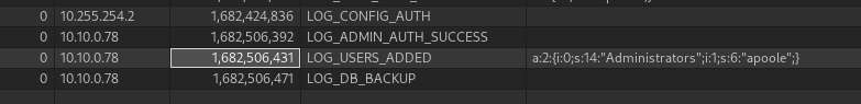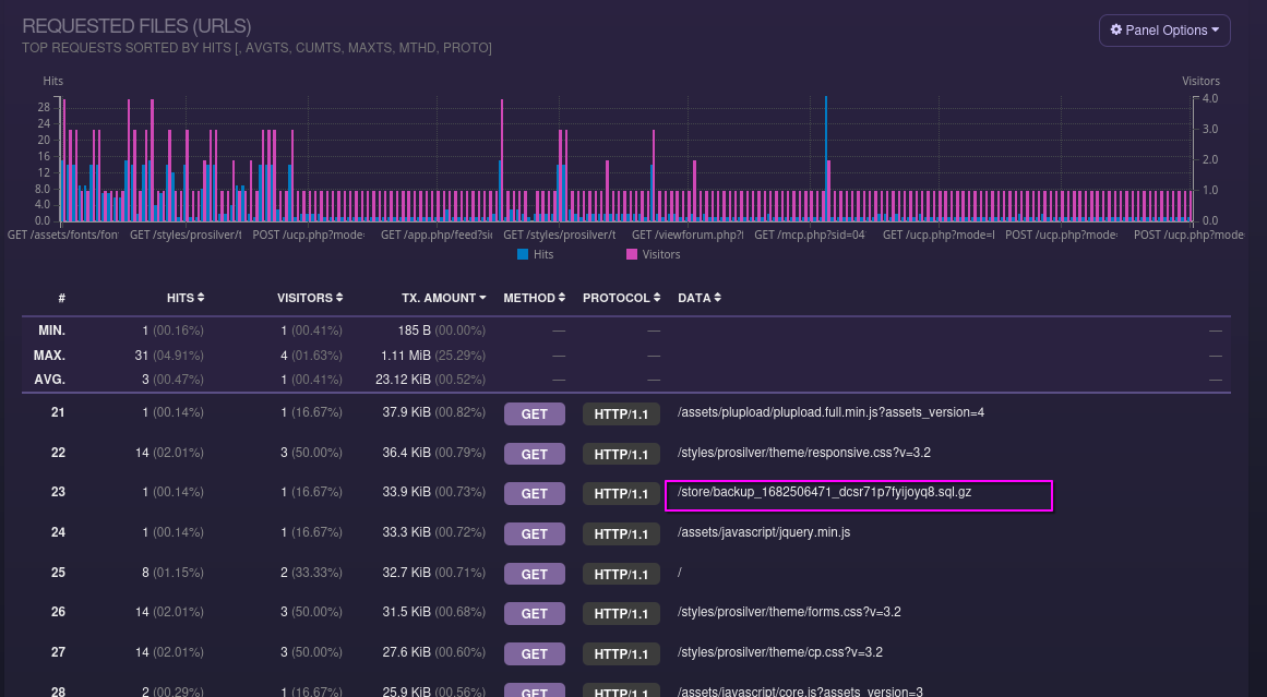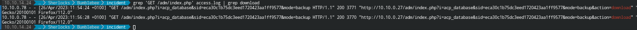10.10.0.78 - - [26/Apr/2023:12:01:38 +0100] "GET /store/backup_1682506471_dcsr71p7fyijoyq8.sql.gz HTTP/1.1" 200 34707 "-" "Mozilla/5.0 (Windows NT 10.0; Win64; x64; rv:109.0) Gecko/20100101 Firefox/112.0"